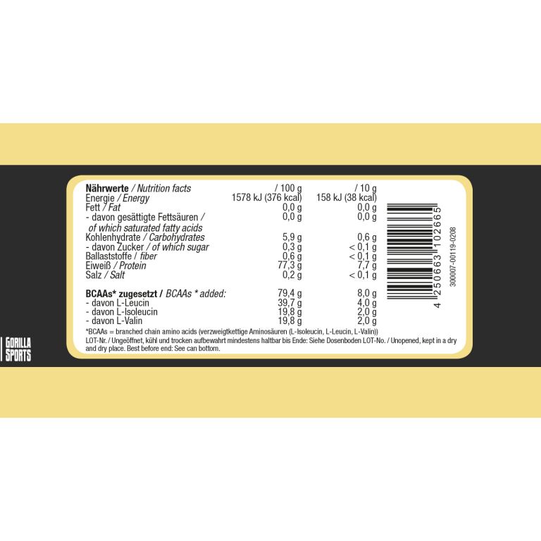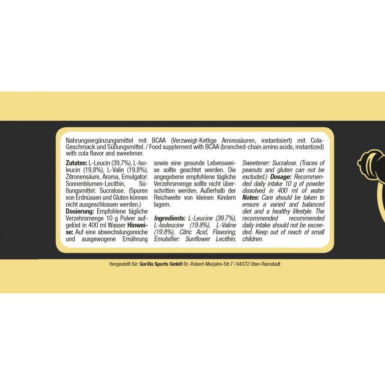 Pozornost je třeba věnovat pestré a vyvážené stravě a zdravému životnímu stylu. Doporučená denní dávka by neměla být překročena. Složení: L-leucin (39,7 %), L-isoleucin (19,8 %), L-valin (19,8 %), kyselina citronová, aroma, emulgátor: slunečnicový lecitin, sladidlo: sukralóza.