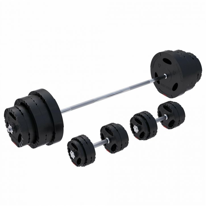 Sada obsahuje různé kotouče a činkové tyče. Kotouče si nasadíte podle potřeby a můžete hned začít s tréninkem.