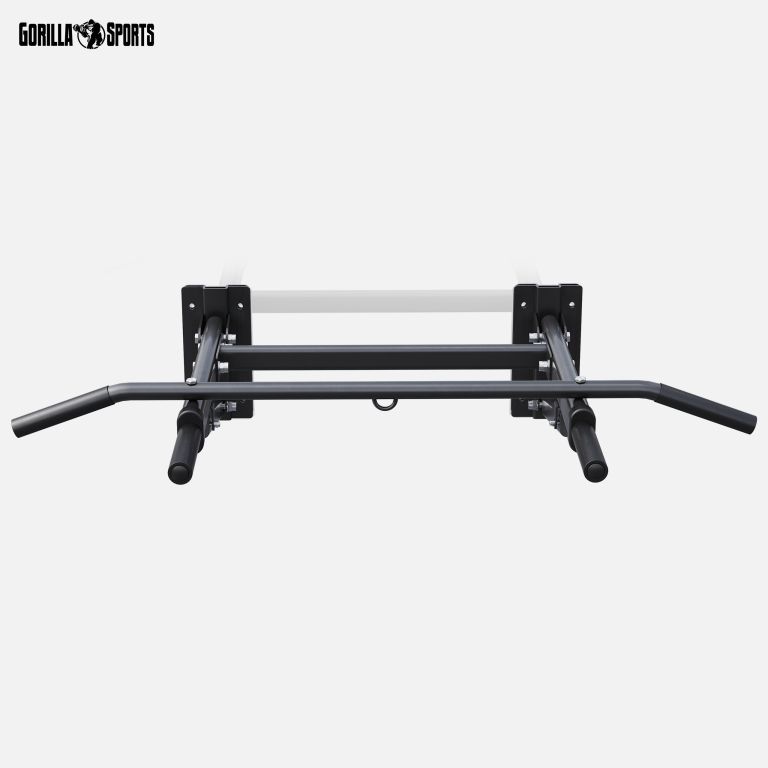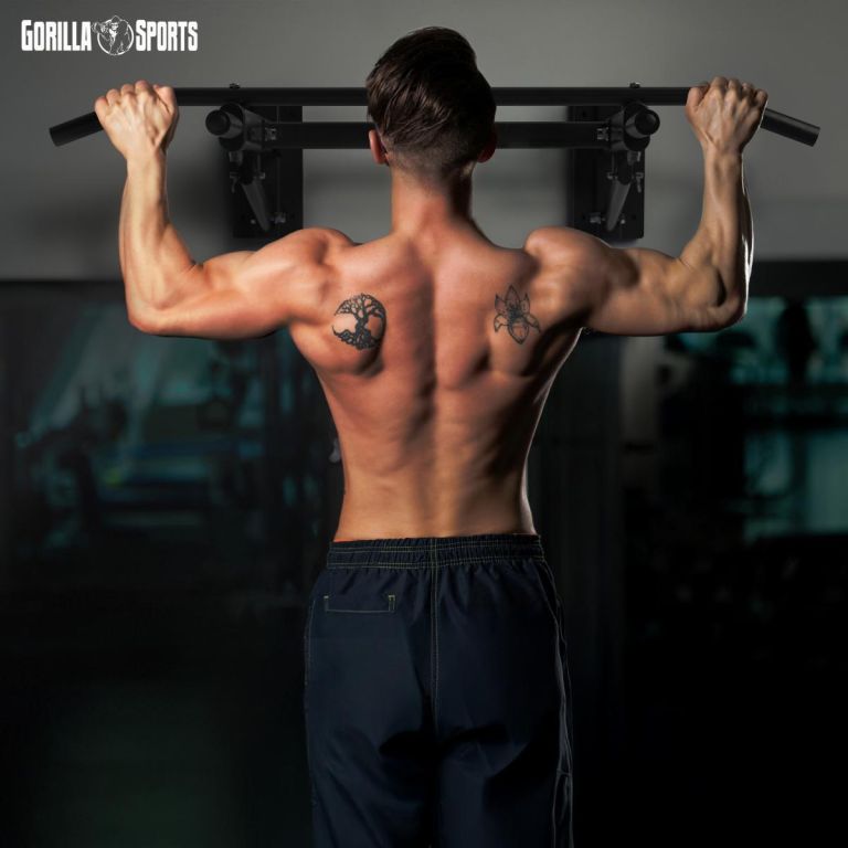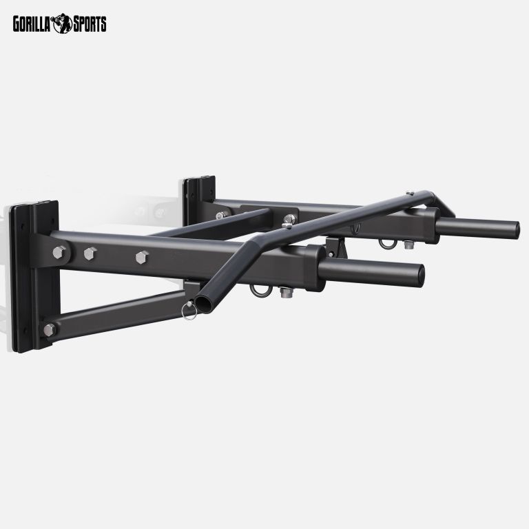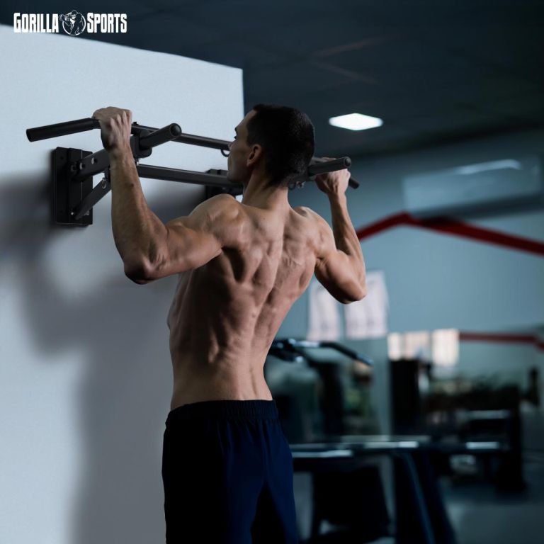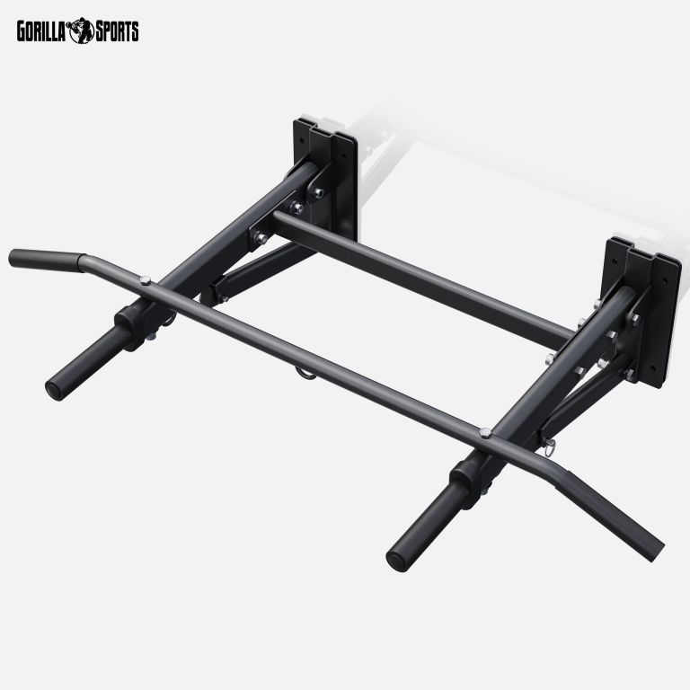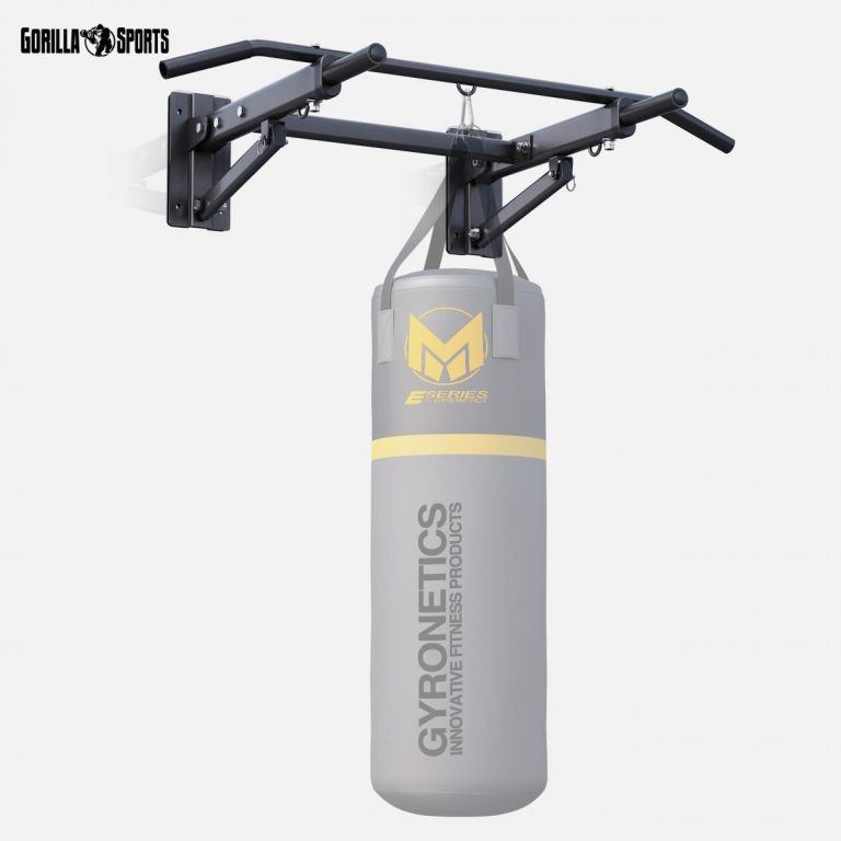 Sklopná nástěnná hrazda Gorilla Sports s pogumovanými úchopy a úchyty na boxsack či expandéry. Šetří místo a přitom zvládne náročné tréninky do 300 kg