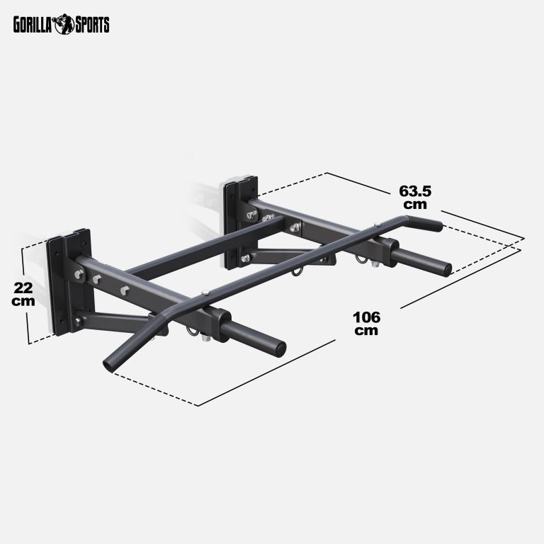 Zobrazit podrobnější popisSklopná nástěnná hrazda Gorilla Sports s pogumovanými úchopy a úchyty na boxsack či expandéry. Šetří místo a přitom zvládne náročné tréninky do 300 kg