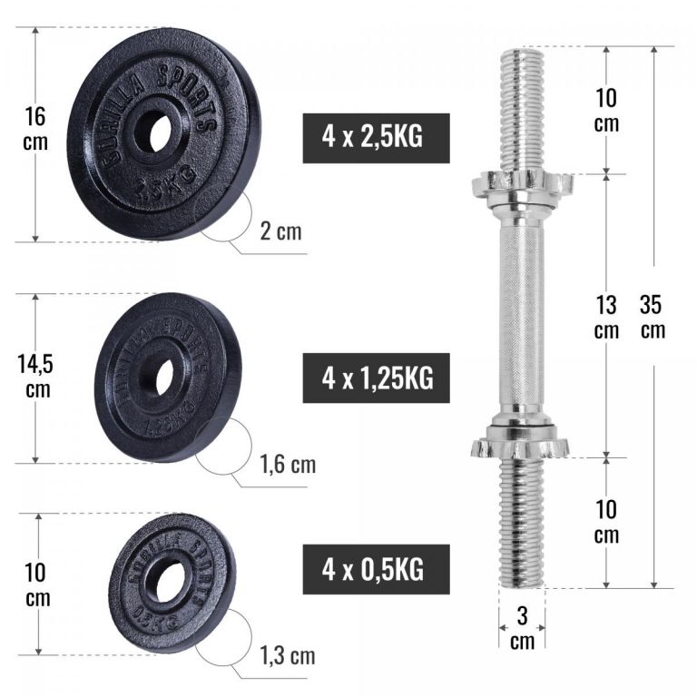 Litinová nastavitelná sada činek 2 v 1 od společnosti Gorilla Sports se skládá z činky, kterou lze během okamžiku rozložit na dvě činky. To vám umožní zaměřit se na svalové skupiny způsobem, který by nebyl možný pouze s činkou. Pevné uchycení zátěžových kotoučů díky dodávaným šroubovým zámkům.