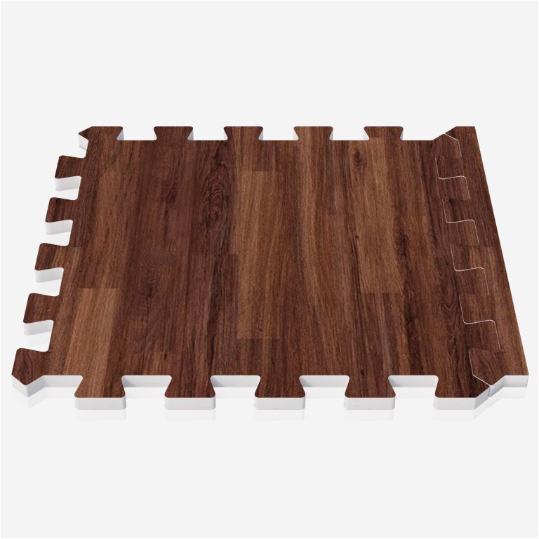 Fitness puzzle podložka v dekoru tmavého dřeva chrání podlahu a tlumí hluk. Snadná montáž, univerzální použití.