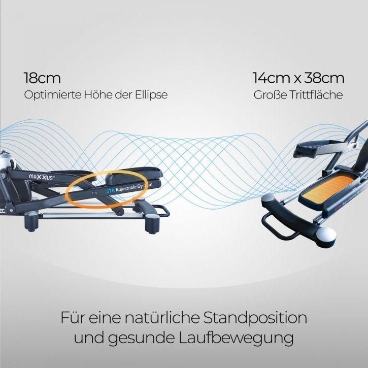 Zdravé držení těla při cvičení na trenažéru je obzvláště důležité, protože nesprávné držení těla může způsobit problémy s klouby. Trenažér byl navržen tak, aby se sekvence pohybů co nejvíce blížila přirozenému pohybu při běhu. Na stroji se budete rychle cítit pohodlně a prvních tréninkových úspěchů dosáhnete již po několika tréninkových jednotkách. Polohy pedálů byly rovněž navrženy s ohledem na ergonomii. Ergonomicky umístěné ruční snímače pulsu umožňují rychlou a pohodlnou kontrolu aktuálního pulsu během tréninku.