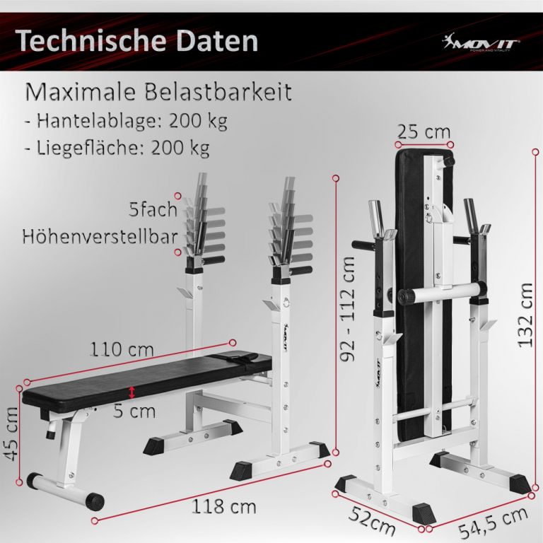 Pětipolohová nastavitelná lavice na posilování s integrovanými držáky. Díky sklopným nohám lze posilovací lavici použít také jako šikmou lavici, včetně popruhu na nohy. Lavici můžete v případě potřeby složit a uložit, díky svým rozměrům nezabere příliš místa.