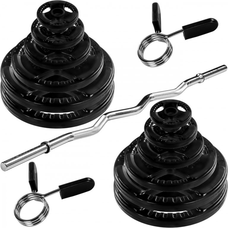 Posilovací sada s hrazdou a vybavením šetří místo a snadno se přepravuje, díky čemuž je ideální pro cesty i doma. Zvlněná posilovací tyč má ergonomický tvar pro trénink šetrný k loktům a zápěstí. Protiskluzové rukojeti s křížovým rýhováním zajišťují bezpečné uchopení i při potu, pružinové uzávěry a činka z chromované oceli, upevnění disku 30 mm (standardní). .