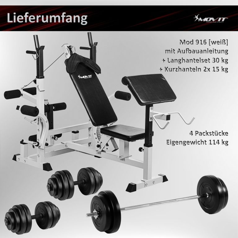 Kombinovaná dlouhá a šikmá lavice, vícenásobně nastavitelné opěradlo a stojan na činky, integrovaný modul kabelové kladky, dvě rukojeti pro ponoření, dva stojany na zadní straně pro vybavení, pogumované stabilní nožičky. Dlouhý stojan na činky (až 180 kg), motýlí ramena (každé až 40 kg), snadno vyměnitelný stojan na kotouly a kleště na nohy (až 60 kg). To vše a mnohem více obsahuje náš set. Naše jednoruční činky jsou velice univerzální. Nejen na procvičení bicepsů a tricepsů, ale i například zádových a bříšních svalů. Obsahují trapézový šroub pro bezepčené upevnění kotoučů. Činkový set 30 kg vám pomůže vypracovat pevné svaly a udržet se ve formě. S touto sadou budete ideálně vybaveni na mnohá silová cvičení. Činky jsou vroubkované, aby se zabránilo nepříjemnému sklouznutí.
