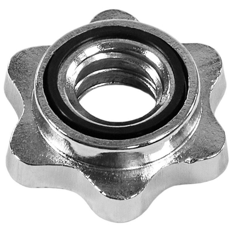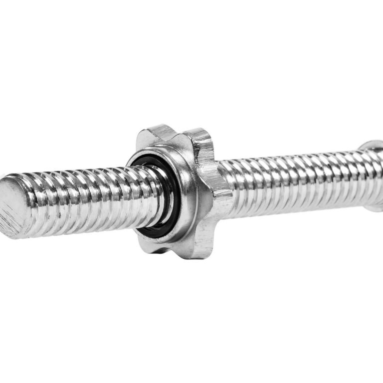 Obouruční hřídel pro nakládací činky chormovaná s vroubkování, aby se Vám lépe držela. Hřídel má lichoběžníkový závit s hvězdicovým šroubem, který bezpečne upevní náhradní kotouče.
