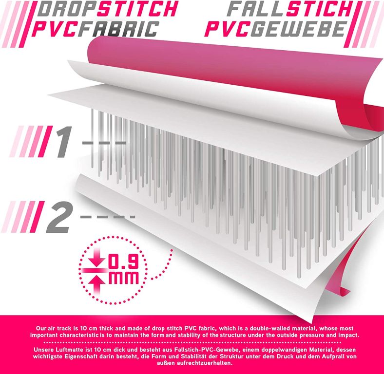 Naše cvičební podložka je silná 10 cm a je vyrobena z plachty z PVC, materiálu s dvojitou stěnou, jehož hlavním rysem je udržení tvaru a stability konstrukce pod vnějším tlakem a nárazem. Tato podložka je vybavena elektrickým vzduchovým čerpadlem a opravnou sadou. Je vhodná pro různé vnitřní i venkovní sporty. Upozornění: Cvičební podložku chraňte před ohněm a ostrými předměty.