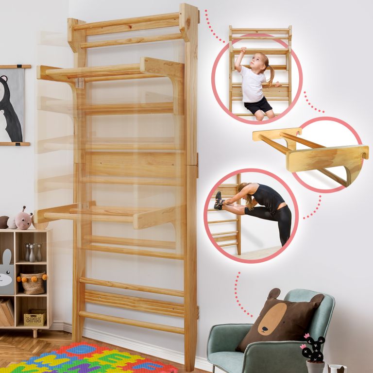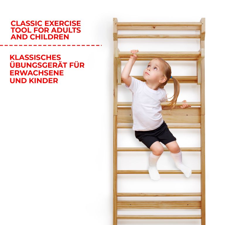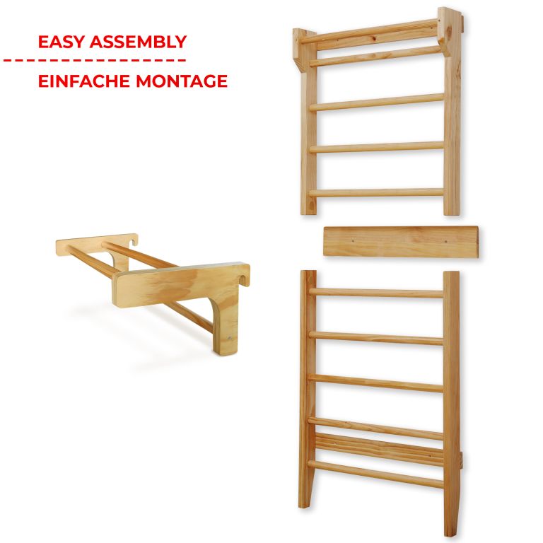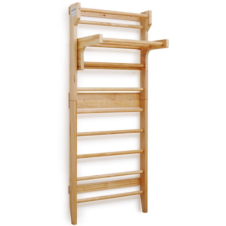 Fitness žebřiny z robusního dřeva a posuvnou hrazdou, jsou spolehlivým a odolným zařízením. Vhodné náčiní pro různé sporty a protahovací cvičení, zejména pro terapeutická cvičení, která mohou zmírnit bolesti zad a další problémy. Výhodou je posuvná hrazda, kterou můžete zavěšením upevnit do výšky dle vašeho výběru a rozšířit tak škálu prováděných fitness cvičení. Upevňovací prvky na stěnu nejsou součástí dodávky.