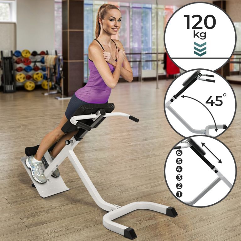 Náš skládací trenažér na záda vám umožní trénovat záda, aniž byste museli platit za posilovnu. Je skládací, má 6 poloh nastavení výšky, má práškovaně lakovanou konstrukci a jeho praktické opěrné úchyty zajišťují stabilitu. Polstrované a výškově nastavitelné upevnění nohou, kde kolečka jsou z pěny s vysokou hustotou. Polstrovaný a čtyřsměrně výškově nastavitelný zádový polštář. Efektivní cvičení díky úhlu 45°.