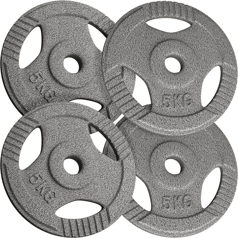 Těžkých činkových kotoučů z litiny se díky svému tvaru a rýhovaným rukojetím snadno uchopí a patří k základní výbavě každé domácí fitness studia.