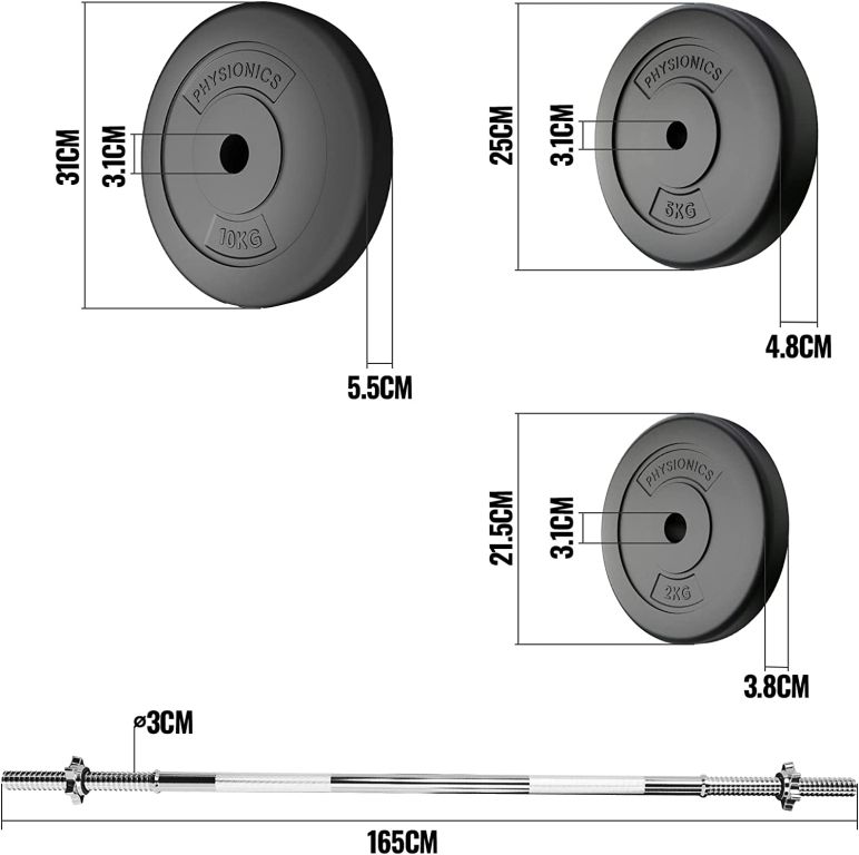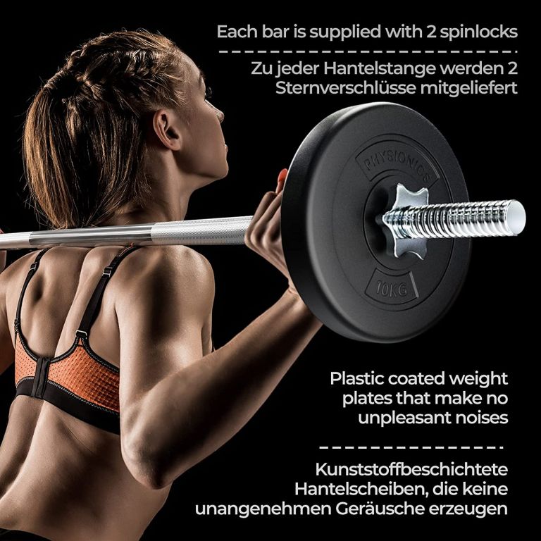 Zohledněte své osobní cíle a schopnosti a přizpůsobte tuto sadu vašemu tréninkovému plánu. Dvě 20 cm dlouhé rukojeti na dlouhé čince mají protiskluzový povrch, který zajišťuje, že vaše ruce nekloužou z tyče. Zátěžové kotouče jsou naplněny cementem a jsou opatřeny odolným plastovým potahem, který nepoškodí podlahovou krytinu.