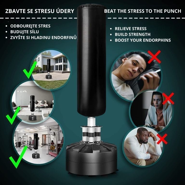 Trénink kdykoli a kdekoli – volně stojící boxovací pytel s 12 přísavkami zajistí stabilitu i bez montáže.