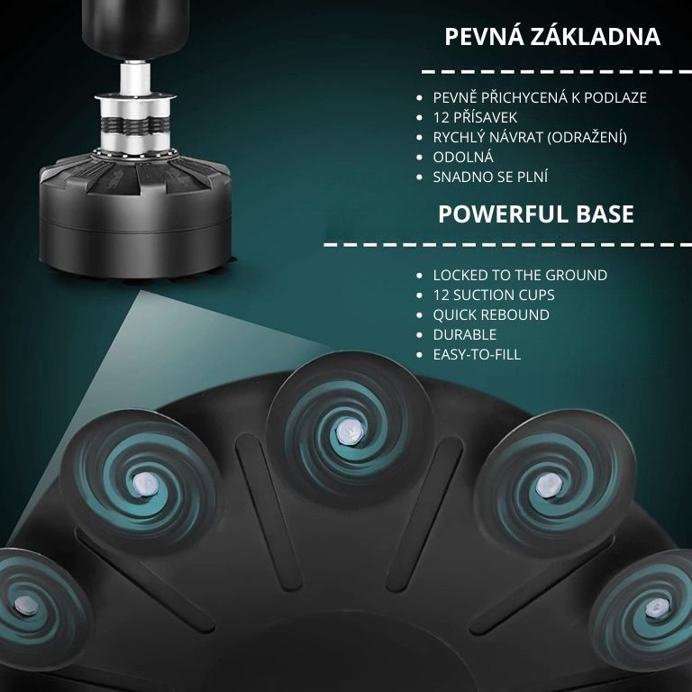 Zobrazit podrobnější popisTrénink kdykoli a kdekoli – volně stojící boxovací pytel s 12 přísavkami zajistí stabilitu i bez montáže.