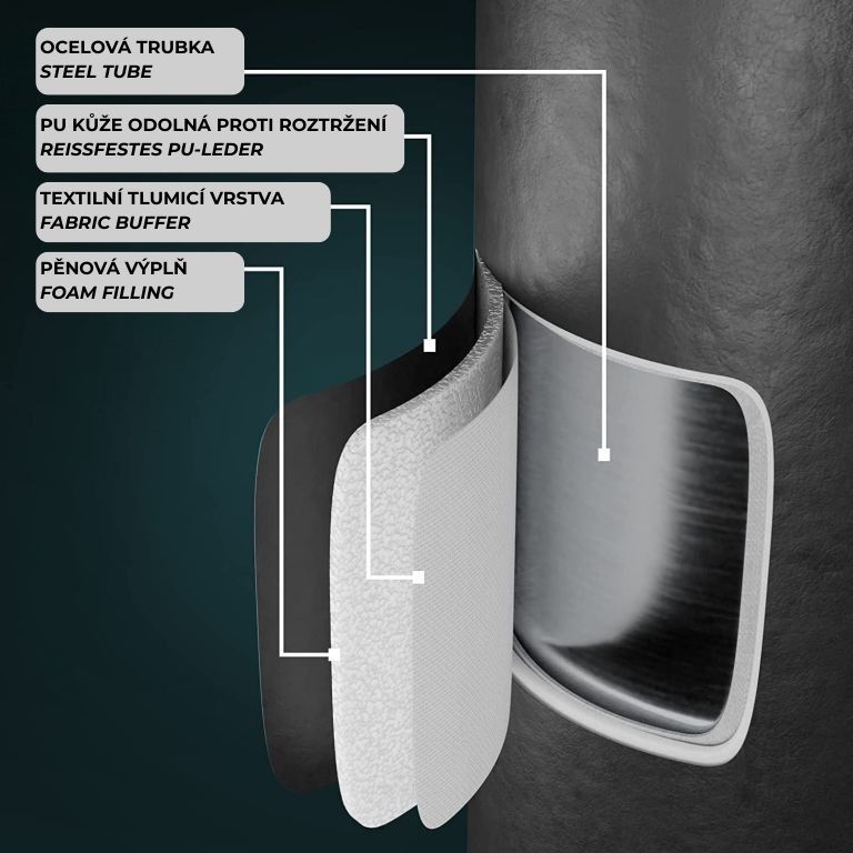 Masivní základna s 12 přísavkami a možností naplnění vodou či pískem zaručuje maximální stabilitu i při silných úderech. Pružinový mechanismus se čtyřmi ocelovými pružinami zajišťuje realistický odpor a rychlý návrat pytle do původní polohy. Boxovací pytel je ručně šitý z odolné PU kůže a nylonu, což garantuje dlouhou životnost a komfortní trénink bez nutnosti montáže na stěnu nebo strop.